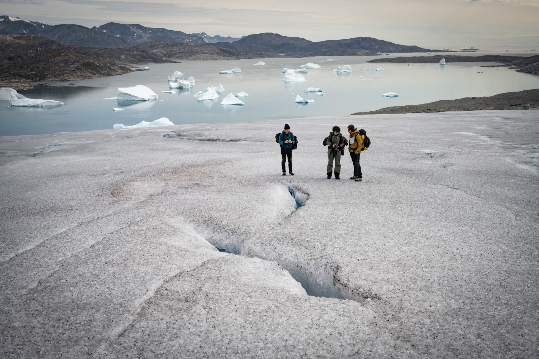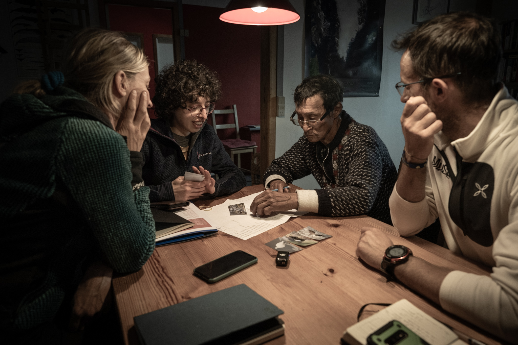 All’attività di campo abbiamo poi affiancato numerosi incontri, più o meno fortuiti, con alcuni membri della comunità locale. E così grazie a Robert Peroni, ci ritroviamo attorno a un tavolo con Johan Uitsatikitseq, un anziano signore che per 40 anni ha insegnato nella scuola di Tasiilaq, e alcune ragazze che lavorano alla Casa Rossa (Naasunnguaq, Celina e Haldora). Con loro esploriamo le conoscenze naturalistiche con particolare riferimento all’uso alimentare della flora e fauna locale destreggiandoci tra particolarissimi termini in groenlandese orientale: Qaqqarqaaq, Tigaangutik, Ittummiittat… difficili da scrivere e da pronunciare. In aggiunta ci raccontano quanto la loro quotidianità sia profondamente legata alla presenza ed estensione del ghiaccio, marino e non: “Per noi, il ghiaccio è tutto…è parte di noi” ci dice il maestro Johan.