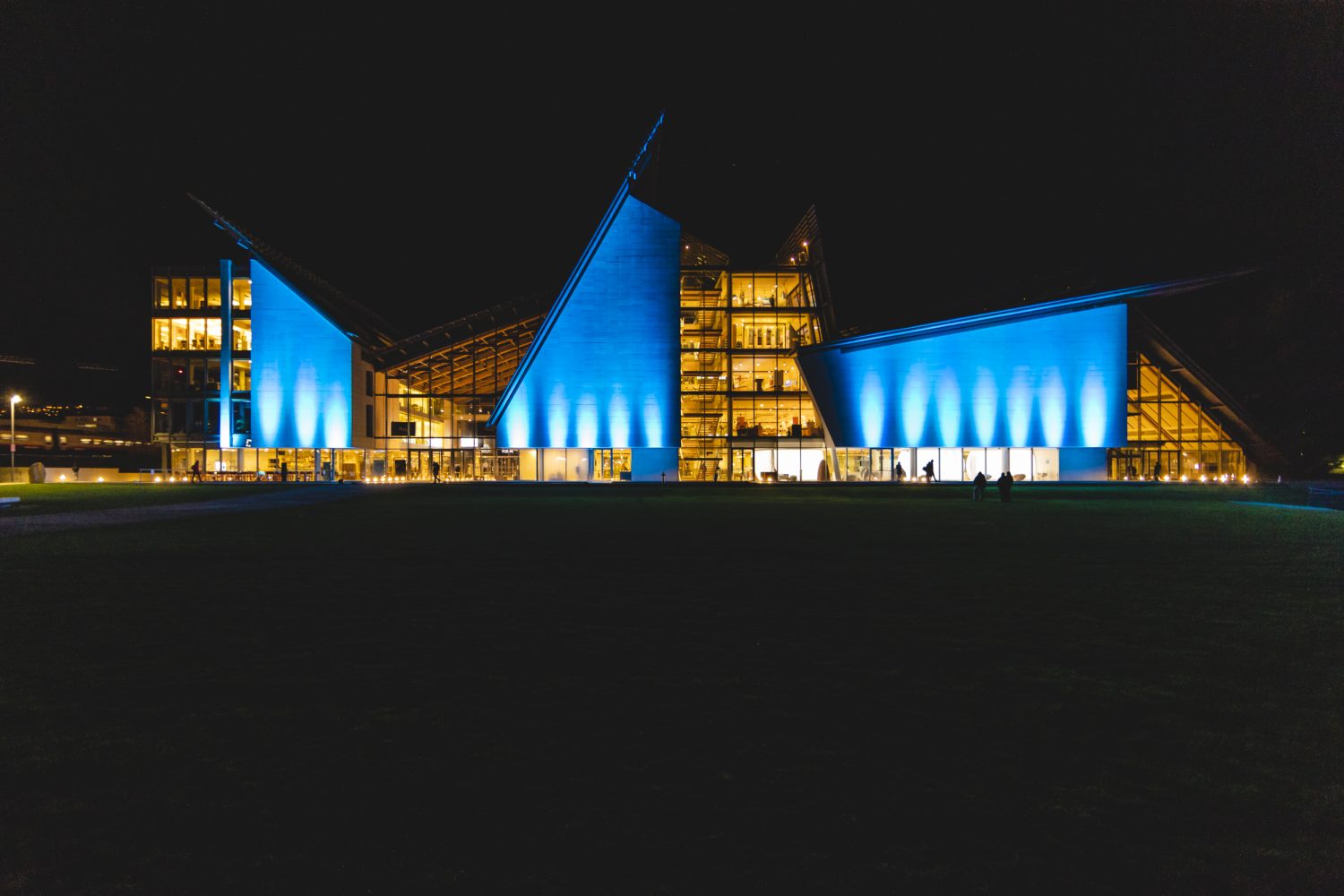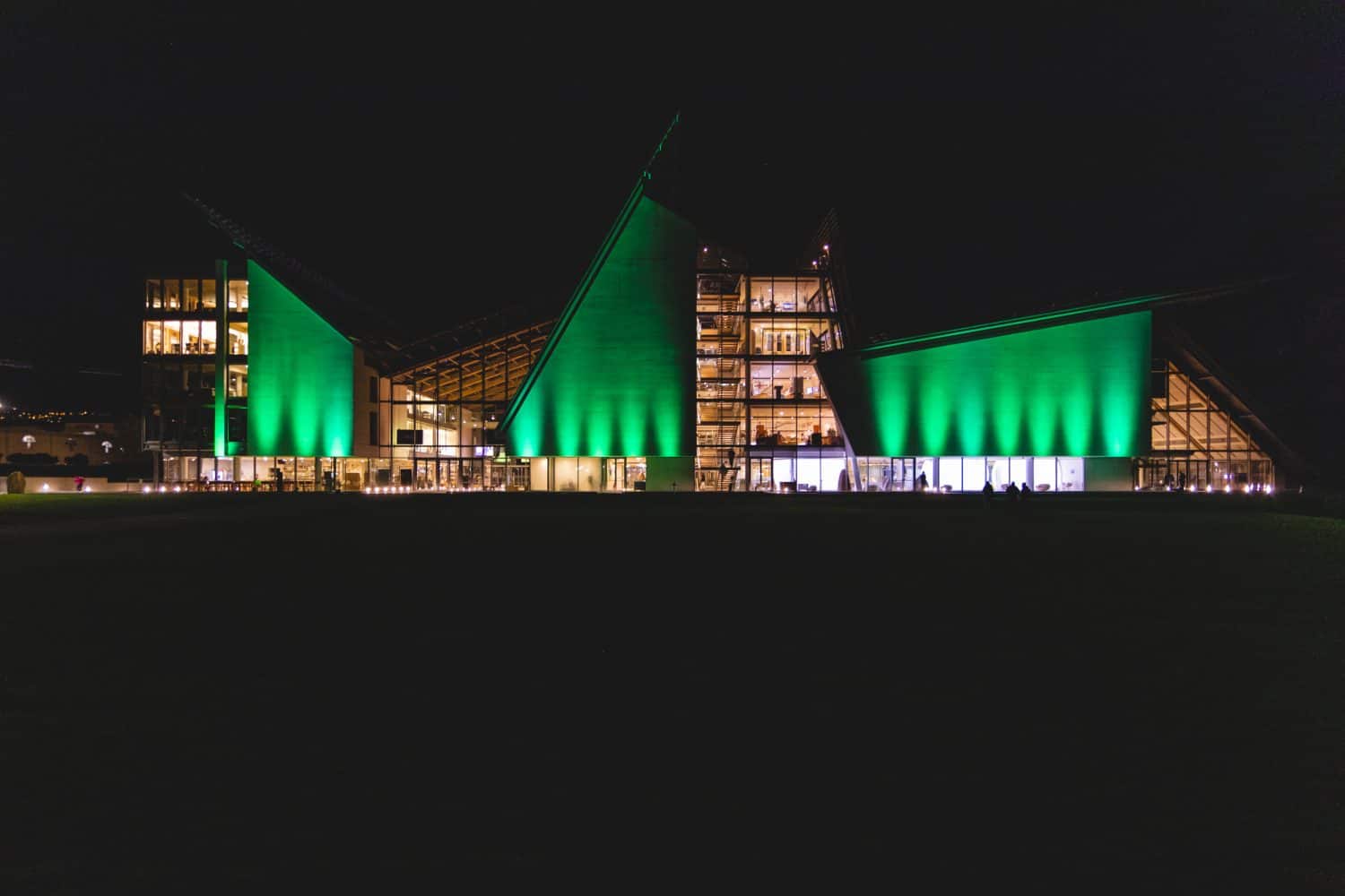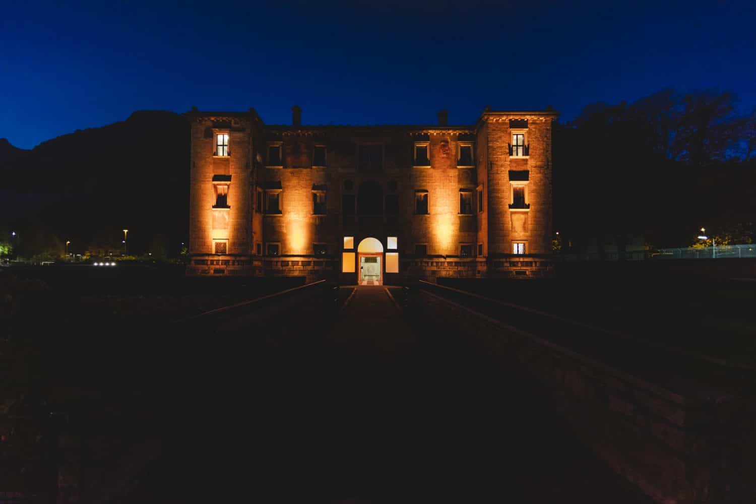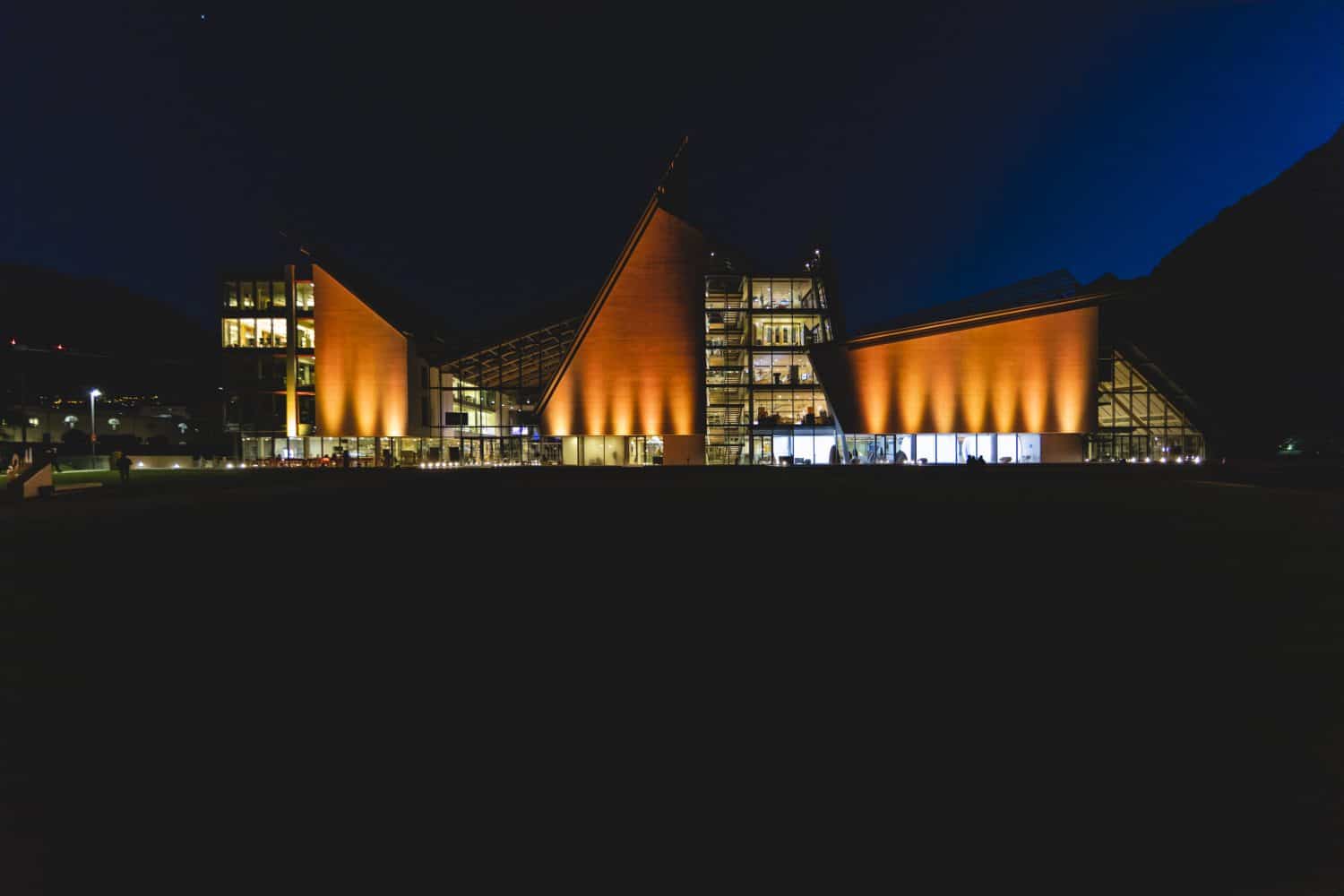 Un bagno di colore accende le facciate di Palazzo delle Albere e MUSE, una partitura luminosa a ritmo di musica che si conclude con un arcobaleno messaggio di speranza.