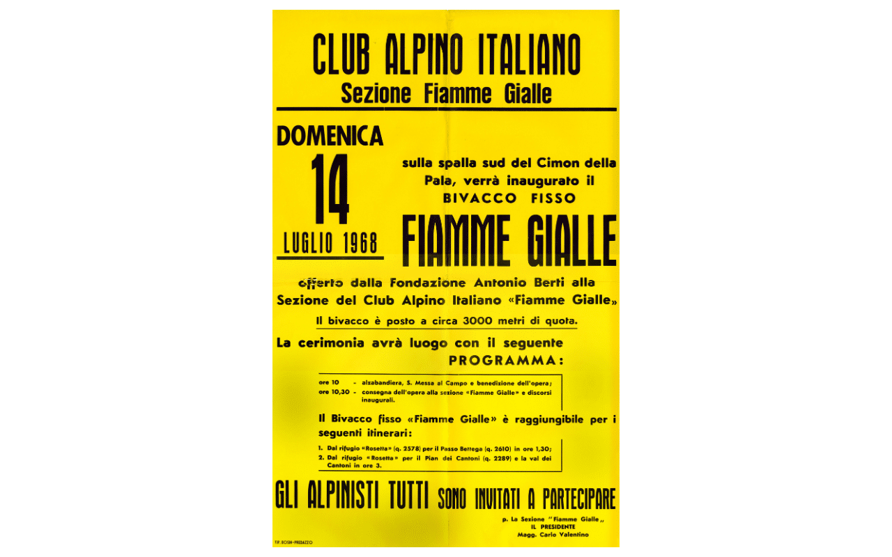 La struttura, realizzata nel 1968 e ospitata a Cimon della Pala, a quota 3.005 metri, è uno dei tre bivacchi storici gestiti dalla Sezione Fiamme Gialle del Club Alpino Italiano.